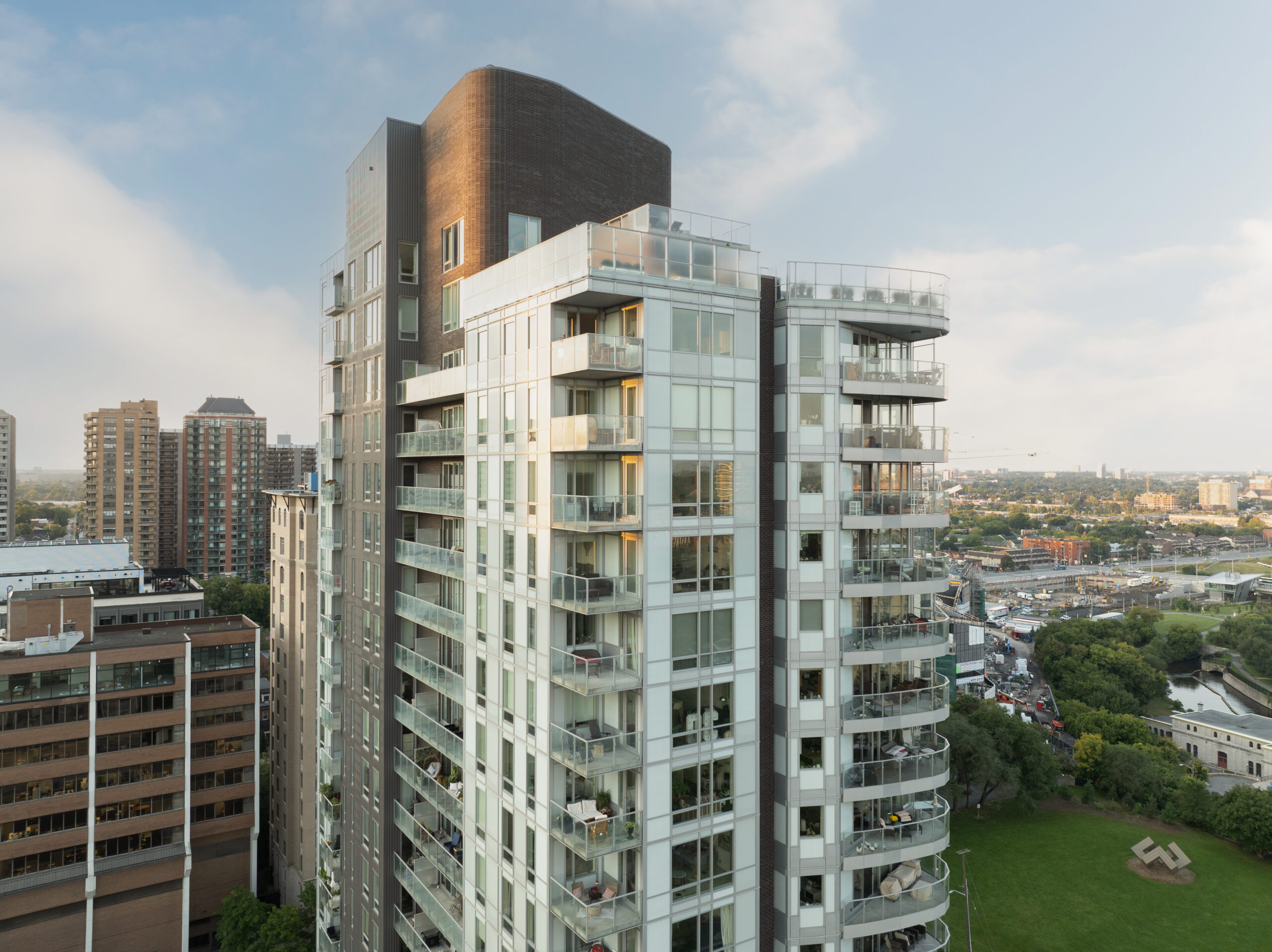 Zero Carbon EnergyThe development exemplifies leading sustainability features for high-rise construction. Suites have individual VRF units with integrated energy recovery ventilators (ERV’s) which are highly efficient and increase fresh air directly into suites (a first for Ottawa). Individual metering of hydro and water encourages conservation. A multi-faceted envelope system, with different elements on the west facade where the greatest sun and wind exposure occurs versus the east façade, enhances the building’s thermal and energy performance.